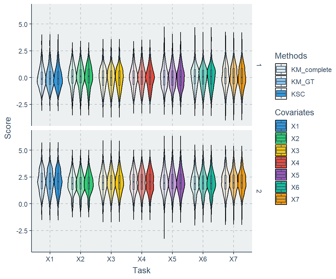 We simulate $n = 500$ observations and 7 random variables with two underlying clusters. The first four columns are treated as fully observed features, while the last three columns are initially generated as complete data and then randomly assigned missing values with missing rate 0.5. Before introducing missingness, standard k-means with $k=2$ is applied to all seven columns to produce a reference clustering based on the full information.